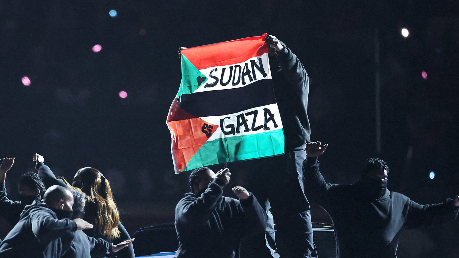 A performer in Kendrick Lamar’s Super Bowl halftime show was detained for raising the Palestinian and Sudanese flags during the performance.