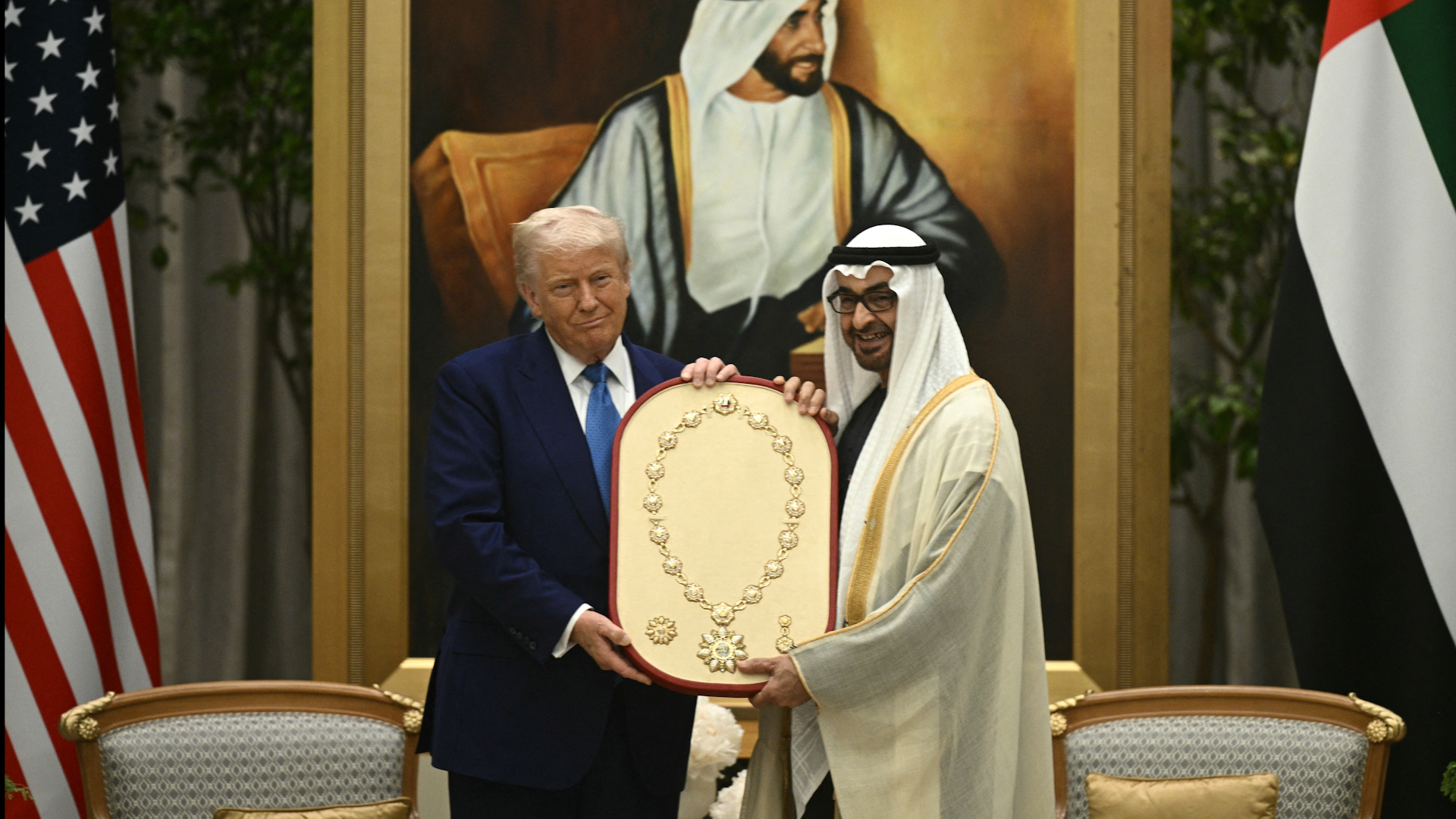 The president of the United Arab Emirates announced plans to invest $1.4 trillion in the US over the next ten years during a visit by President Trump, who was given the UAE’s Order of Zayed.