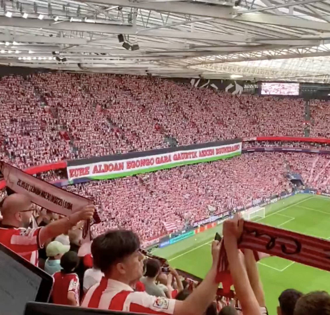 “From today until the very last day, we stand with you.” Athletic Bilbao fans printed this statement on a banner of a huge Palestinian flag, holding it up in the stadium on Tuesday’s UEFA Champions League fixture against Arsenal.