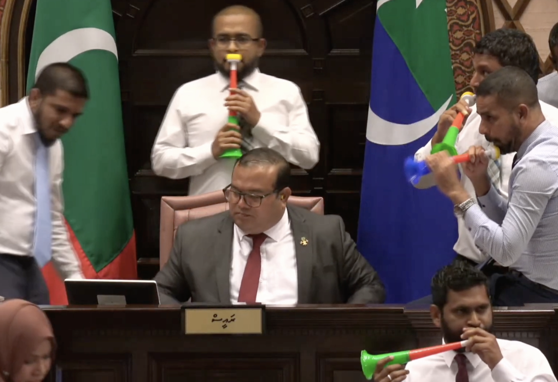 MPs went after each other, throwing punches, pulling hair and blowing toy trumpets during a rowdy session of parliament.